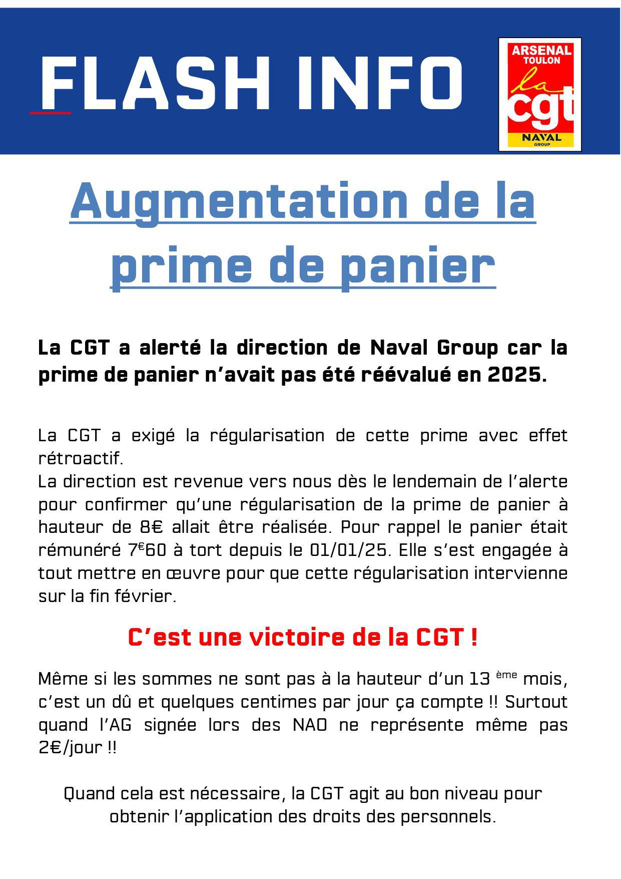 La CGT a interpellé la direction centrale pour l'informer qu'elle n'avait pas tenu compte de la revalorisation de la prime de panier. Devant la "force de la preuve", Naval Group revalorisera la prime de panier au montant légal de 8€. L'effet rétroactif est actuellement en cours de discussion.